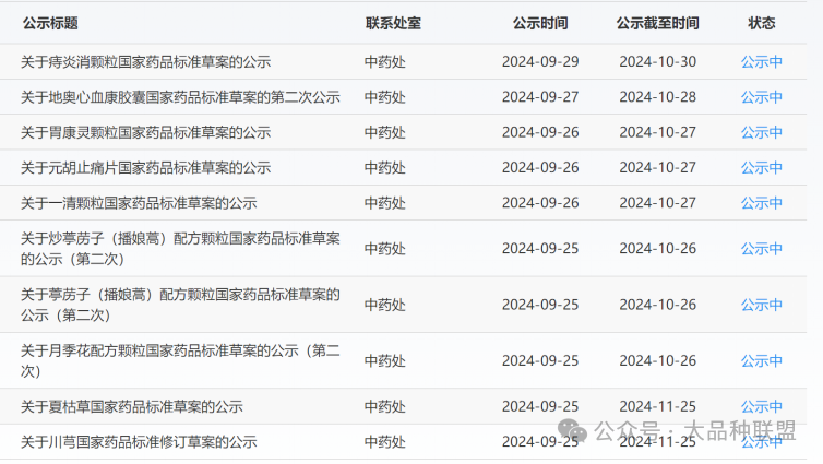 2024年9月29-30日,國家藥典委公示了19個中藥標(biāo)準(zhǔn)草案:黃連、艾葉、川芎、延胡索(元胡)、棕櫚、益智、柏子仁、大豆黃卷、北沙參、黃芩、防風(fēng)、白屈菜、天然冰片(右旋龍腦),冰片(合成龍腦),艾片(左旋龍腦);古漢養(yǎng)生精顆粒、古漢養(yǎng)生精口服液、古漢養(yǎng)生精片、心可舒片、消腫止痛酊。