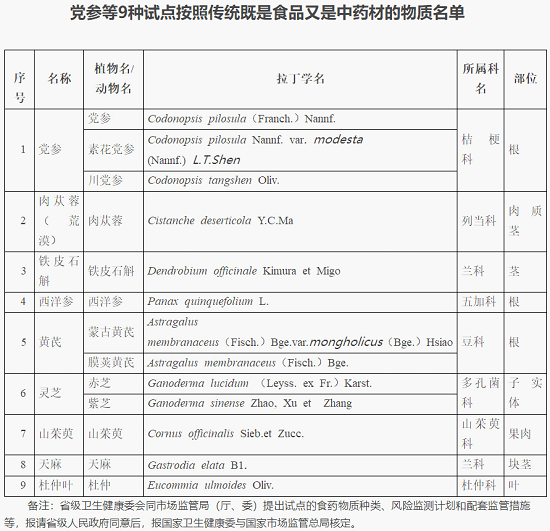 關(guān)于對黨參等9種物質(zhì)開展按照傳統(tǒng)既是食品又是中藥材的物質(zhì)管理試點工作的通知