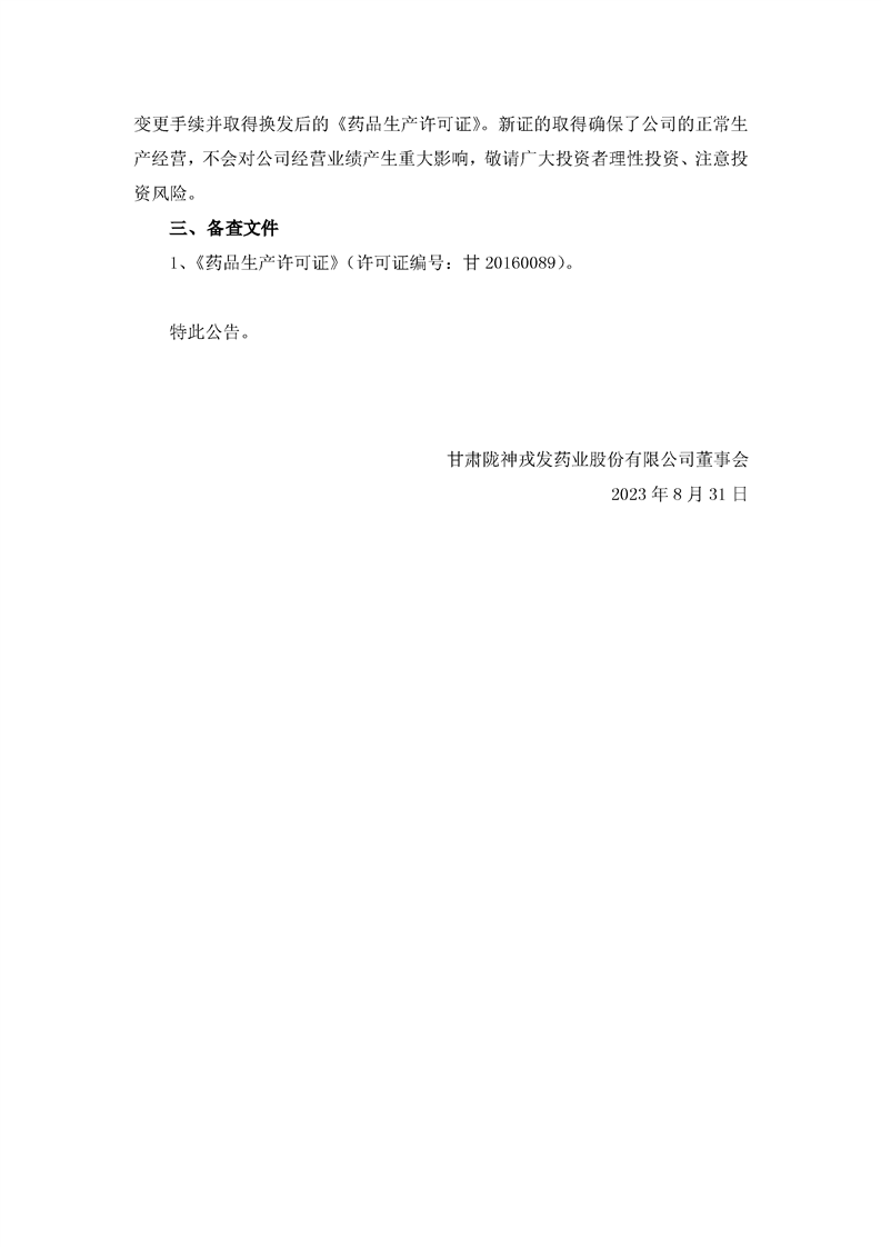 關(guān)于控股子公司取得換發(fā)后的《藥品生產(chǎn)許可證》的公告