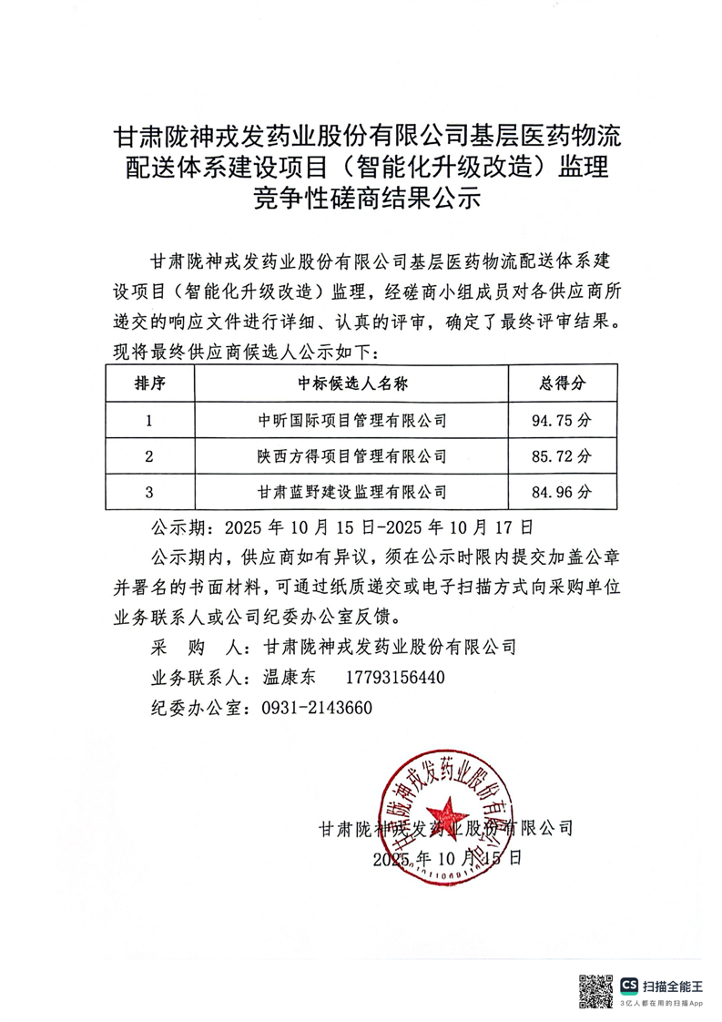 甘肅隴神戎發(fā)藥業(yè)股份有限公司基層醫(yī)藥物流配送體系建設項目(智能化升級改造)監(jiān)理競爭性磋商結果公示