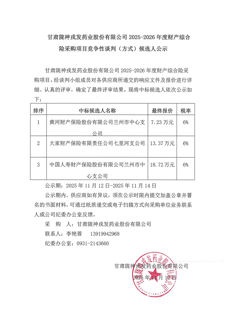 甘肅隴神戎發(fā)藥業(yè)股份有限公司2025-2026年度財(cái)產(chǎn)綜合險(xiǎn)采購(gòu)項(xiàng)目競(jìng)爭(zhēng)性談判(方式)候選人公示