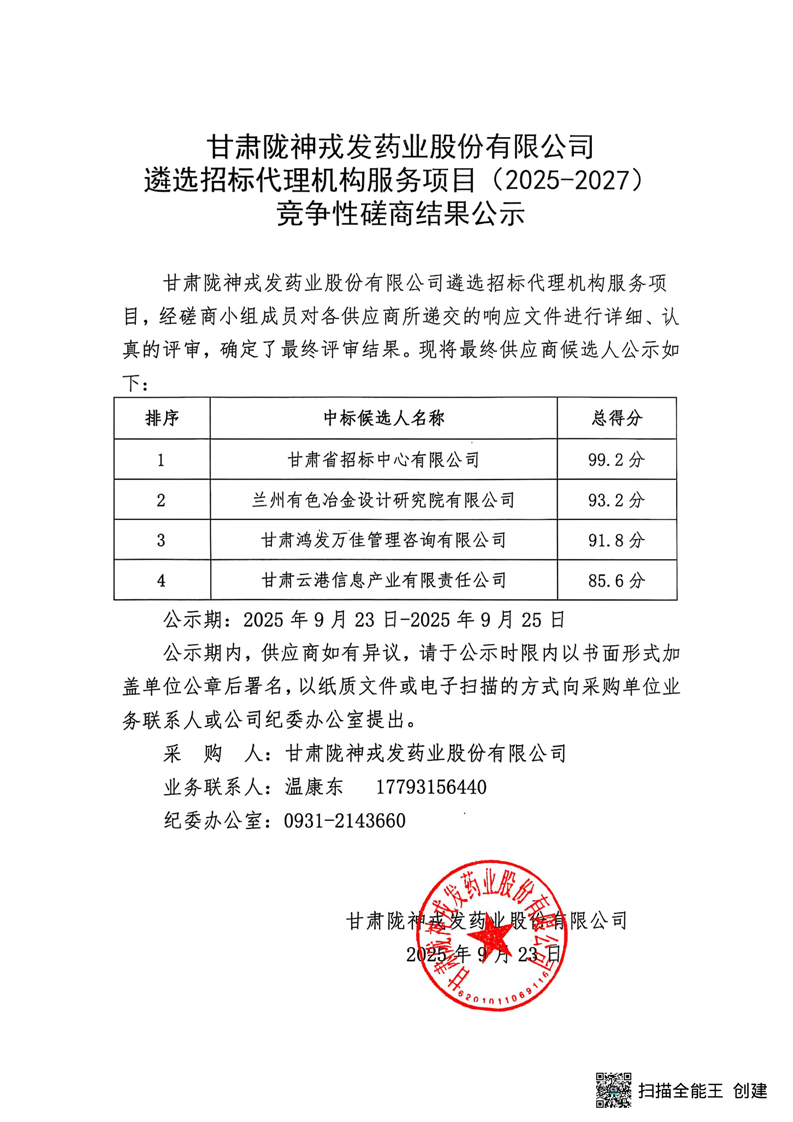 甘肅隴神戎發(fā)藥業(yè)股份有限公司遴選招標(biāo)代理機(jī)構(gòu)服務(wù)項目(2025-2027)競爭性磋商結(jié)果公示